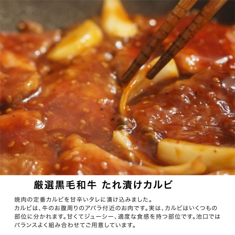 和牛肉/タレつけカルビ:和牛(国産)、漬け込みのたれ(砂糖(国内製造)、醤油、果汁(りんご、洋なし、レモン)、発酵調味料、水飴、にんにくペースト、胡麻、食塩、香辛料、野菜発酵調味料、香味油、かつおエキス、食用植物油脂/増粘剤(加工でんぷん、キサンタン)、調味料(アミノ酸等)、酸化防止剤(V.C)、酒精、パプリカ色素、香料、紅こうじ色素(一部に小麦・かに・牛肉・大豆・りんご・ごま・いかを含む)