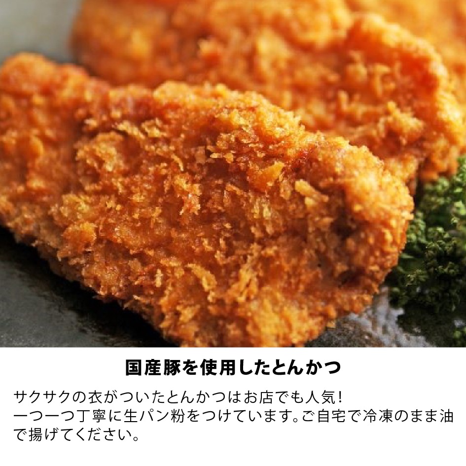 豚ロース肉(国産)、生パン粉、粉末調味料(小麦粉、植物性たん白、コショウ末、砂糖、食塩)、味塩コショウ、ナツメグパウダー/膨張剤、調味料(アミノ酸等)、pH調整剤、V.C、イーストフード、乳化剤