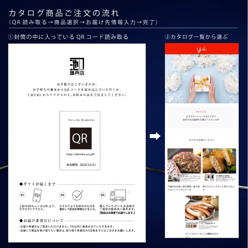 QRコードを読み取り、Web上で商品を選んで届け先も入力!
